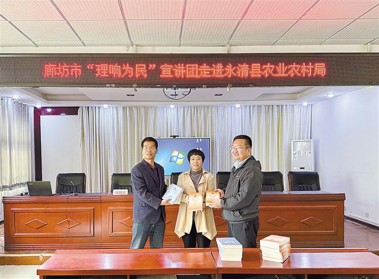 图为宣讲团为永清县农业农村局发放学习辅导读物。 本报通讯员 刘佳静 本报记者 王静 摄